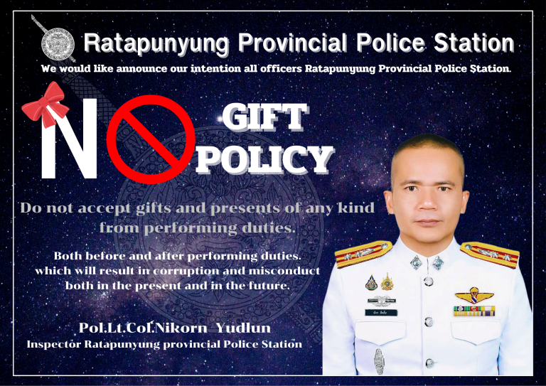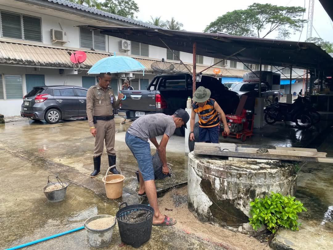พ.ต.ท.นิกร ยึดลั่น สว.สภ.ราตาปันยัง พบปะเจ้าหน้าที่กรมทางหลวงชนบทที่มาซ่อมถนน ได้อำนวยความสะดวกการจราจรและได้มอบเครื่องดื่ม ณ สามแยกทางเข้า สภ.ราตาปันยัง