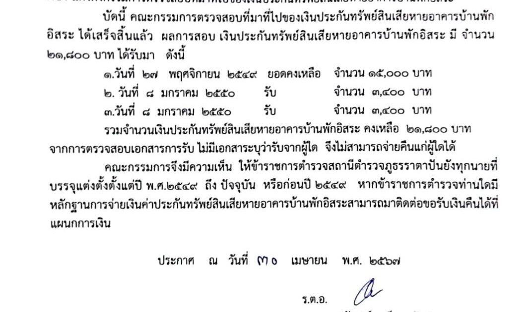 แจ้งประชาสัมพันธ์การเก็บเงินค่าประกันทรัพย์สินเสียหายประจำบ้านพักราชการ จำนวน1000บาท ตามระเบียบ 1 พฤษภาคม 2567 โดย DRadmin / ข่าวประชาสัมพันธ์ แจ้งประชาสัมพันธ์ ข้าราชการตำรวจ สถานีตำรวจภูธรราตาปันยัง ทุกนาย ตามที่ สถานีตำรวจภูธรราตาปันยัง ได้เก็บเงินค่าประกันทรัพย์สินเสียหายประจำบ้านพักราชการ จำนวน ๑,๐๐๐ บาท ตามระเบียบนั้น เนื่องจากเงินดังกล่าวไม่มีรายละเอียดว่าเก็บมาจากผู้ใด และไม่มีหลักฐานการเก็บเงินดังกล่าว จึงขอประชาสัมพันธ์ หากข้าราชการท่านใดมีหลักฐานการเก็บเงิน สามารถนำหลักฐานมาขอเบิกเงินดังกล่าวได้ ณ.สถานีตำรวจภูธรราตาปันยัง ประกาศ ณ วันที่ ๑ พฤษภาคม ๒๕๖๗ FacebookFacebookXXLINELine